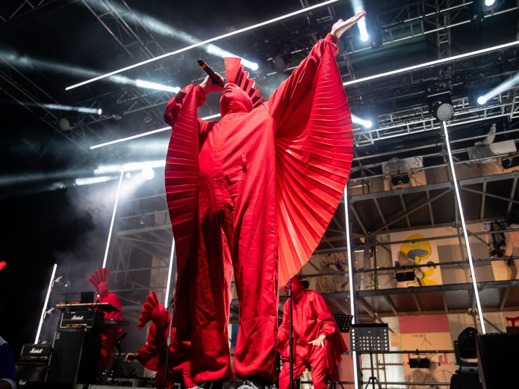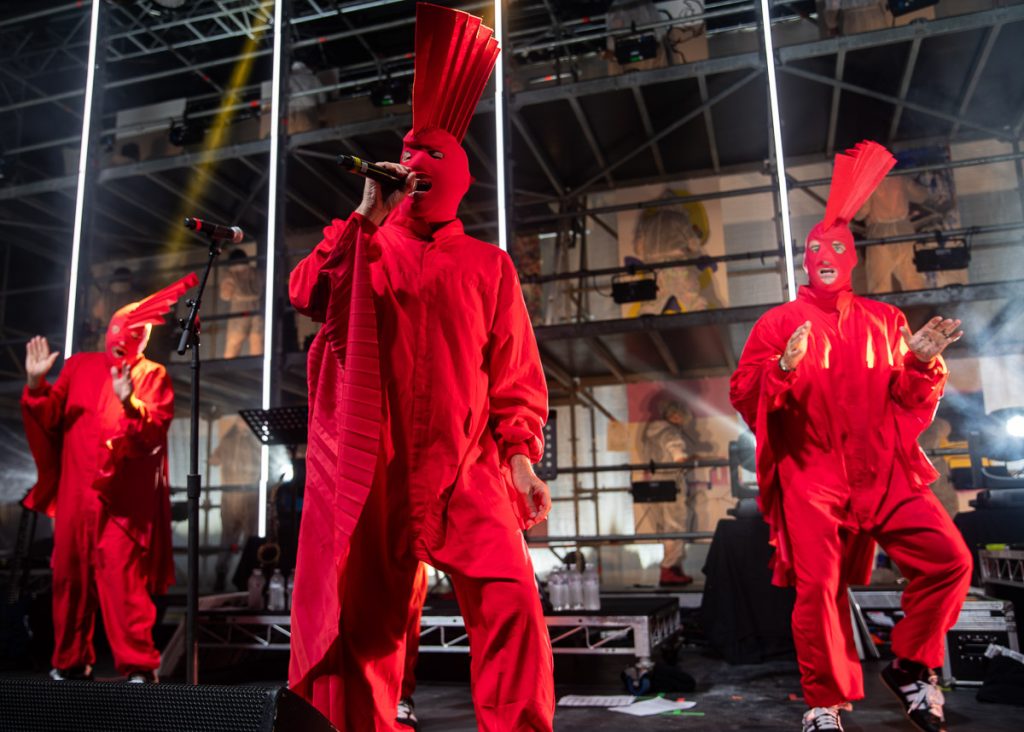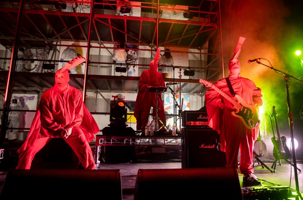 TISM: “When Kyle Sandilands dies…” is one hell of an opening statement from the bright red, Mohawk sporting masked hoodlums. “From death… to art.” Bouncing off each other like toddlers looking to sumo wrestle, ‘’l’ll ‘ave Ya” turns the Riverstage into a jumping castle. And as the kabuki drops, a mountain of scaffolding covers the stage. Painters fill the levels partaking in their art. What are they painting? Who knows and who cares? TISM are here to put Death to Art.