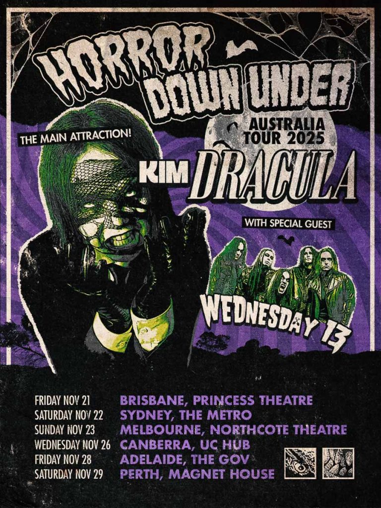 Joining KD for this most triumphant homecoming is the absolute legend, Wednesday 13 who returns on the back of a sold out Australian tour in 2023 celebrating his former band Murderdolls.