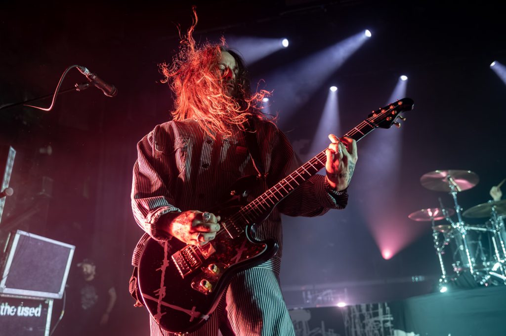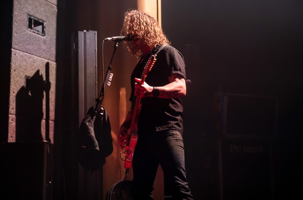A white background dropped from the ceiling, as the crowd waited for 9pm to roll around. And almost to the second, the lights dimmed, as a video package played on the white canvas sheet, advising everyone to prepare for the night’s activities. A countdown played, before we got footage of the band circa 2002, showing the writing, recording, and touring of the bands break out debut record. After the package played, lights lit up the band through the sheet, as the intro to ‘Maybe Memories’ played. The opening vocals dropped the sheet, as Bert, Jeph, Dan, and Joey all moshed out on stage to the track. The staging for the band was awesome. Red carpet on the floor, with two elevated platforms around the drum kit, and Dan’s drums were elevated, with the text of The Used written underneath on a black banner. ‘Maybe Memories’ has been one of my favorite songs of The Used’s entire catalogue. So seeing it live again makes me so happy.
