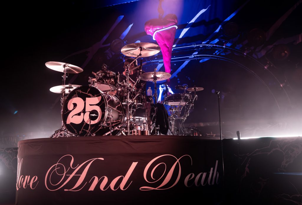 Greeting us again on night two, was once again, the white backdrop. This time, showing us the history of the band between the end of the Self Titled era, and during the In Love and Death era. This was probably my favorite package of the three nights, as this is my favorite era of the band. Seeing all the flashbacks gave me crazy nostalgia, and prepped me for the unreal night that was about to unfold. The curtain dropped after the intro to ‘Take it Away’ played, as the crowd was bouncing like maniacs. The banner underneath the drums had been replaced, with the text logo for In Love and Death. Above the drum kit, the hanging heart lit up, as ‘I Caught Fire’ kicked in, and the mosh bounced again.