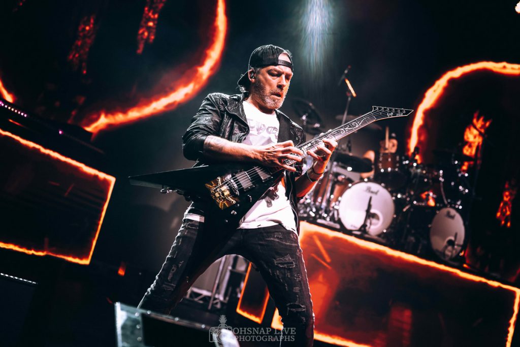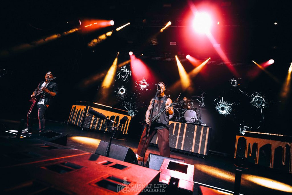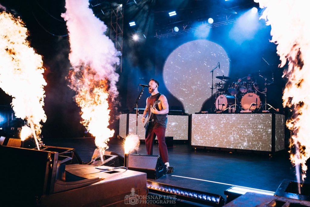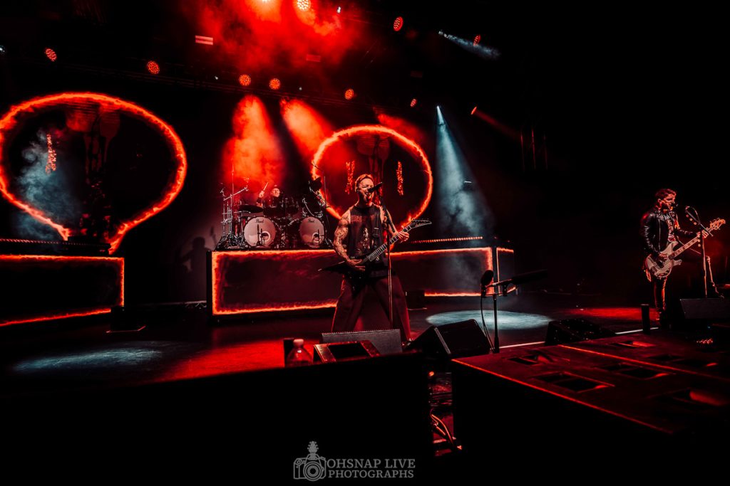 Dead at 8:30pm, the entire venue lights went out, as a light board started to play videos of a very young Bullet for My Valentine. The video went over their accomplishments from when The Poison was released, and showed clips of them from the 2004-2005 era. The video ended, as the stage bathed in red lights, and showed the skull from the 2021 self-titled record, which seemingly has become the band’s logo. The intro to The Poison played over the speakers, as Michael “Padge” Paget and Jamie Mathias took places on some high rise platforms at the back of the stage, flanking drummer Jason Bowld. Matt Tuck then walked out to the front of the stage, as the initial scream for ‘Her Voice Resides’ kicked off the anniversary playthrough. Fire cannons were going nuts through the song, and it felt like the entirety of Brisbane was with us at the venue, the crowd was that loud. Padge and Mathias joined Tuck down front as the crowd mosh and sang loudly.