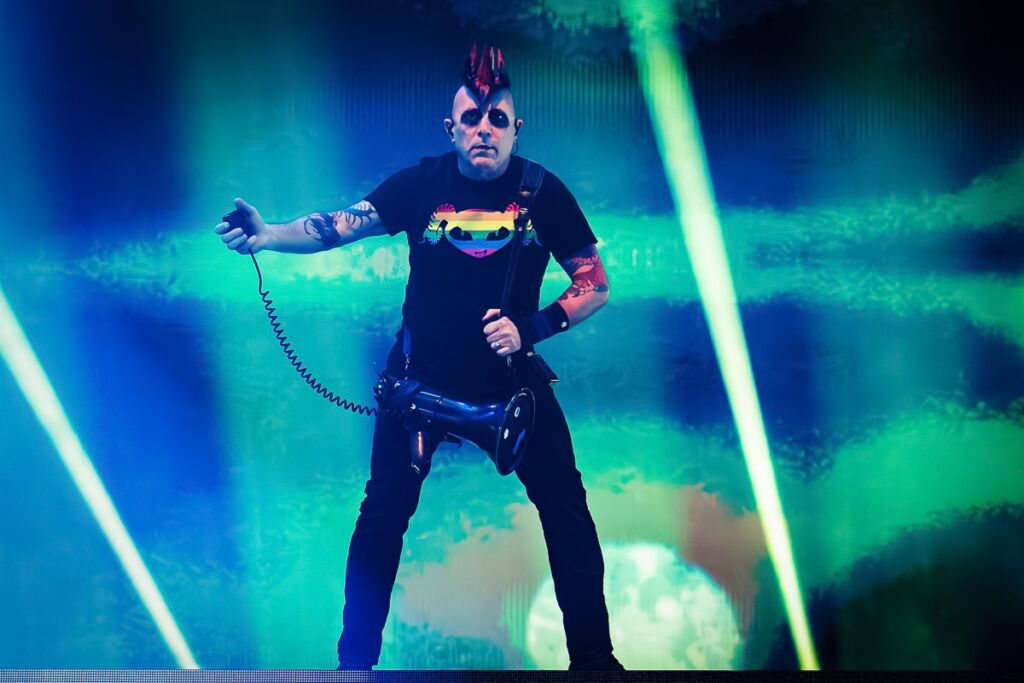 Then, Machine Head were next and the beer flowed – as did the catching of the beer – and they won the most crowd surfers over the barrier game. There was a massive crowd, as we at the barrier, felt the pressure especially when the circle pit went off! Machine Head were playing as a trio for this 11-song set. Their guitarist Reece Scruggs stayed in the US to support his father who was diagnosed with lung cancer. The rest of the band (Robb Flynn, Jared MacEachern, Matt Alston) delivered raw, headbanging power with intense energy to the crowd. The pirate flags and backdrops had cool imagery – plus they were fire pillars, confetti and smoke canons, and inflatable dice bouncing around the crowd.