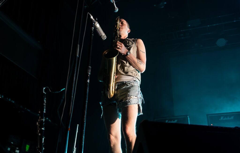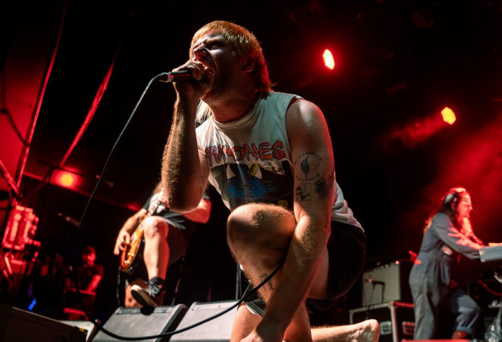 I’ve never seen Fortitude Music Hall’s floor so slick with spilled drinks — the crowd was a little sloppy in places. The changeover between bands was quick, and before long Viagra Boys were on stage. Singer Sebastian Murphy swaggered out wearing a green felt elf hat, shirtless, carrying a carton of A2 milk and a glass full of ice. With little ceremony, they launched straight into ‘Man Made Of Meat’, ‘Slow Learner’ and ‘Waterboy’, during which Murphy took a swig of beer and sprayed it into the air, then followed up with another spray directed straight at the crowd. He later sorted his milk situation, explaining he had to drink that type because he was lactose intolerant.