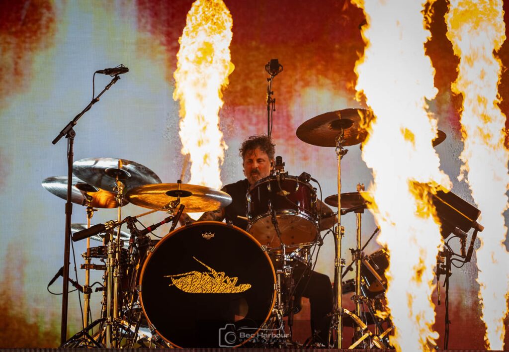 A lot of the set was tracks from Homesick and the new record, Big Old Album Vol. 1, and we got our first taste of the new stuff with ‘Bad Blood’, before McKinnon called for circle pits for ‘Paranoia’. Hearing ‘Miracle’ live was cool as hell, as the backboard that was showing different versions of the band logo had this one being covered in rain. It set an amazing aesthetic and mood, which would be a cool theme throughout the night. Also, something I haven’t mentioned. They had fans on stage the entire set. Which is something I’ve never seen before. They basically had a whole pit section behind Alex Shelnutt’s drum kit, where there was a barrier separating the band and the fans on stage. But they stayed the entire show, through every bit of pyro, which would have been an absolute dream.