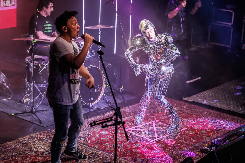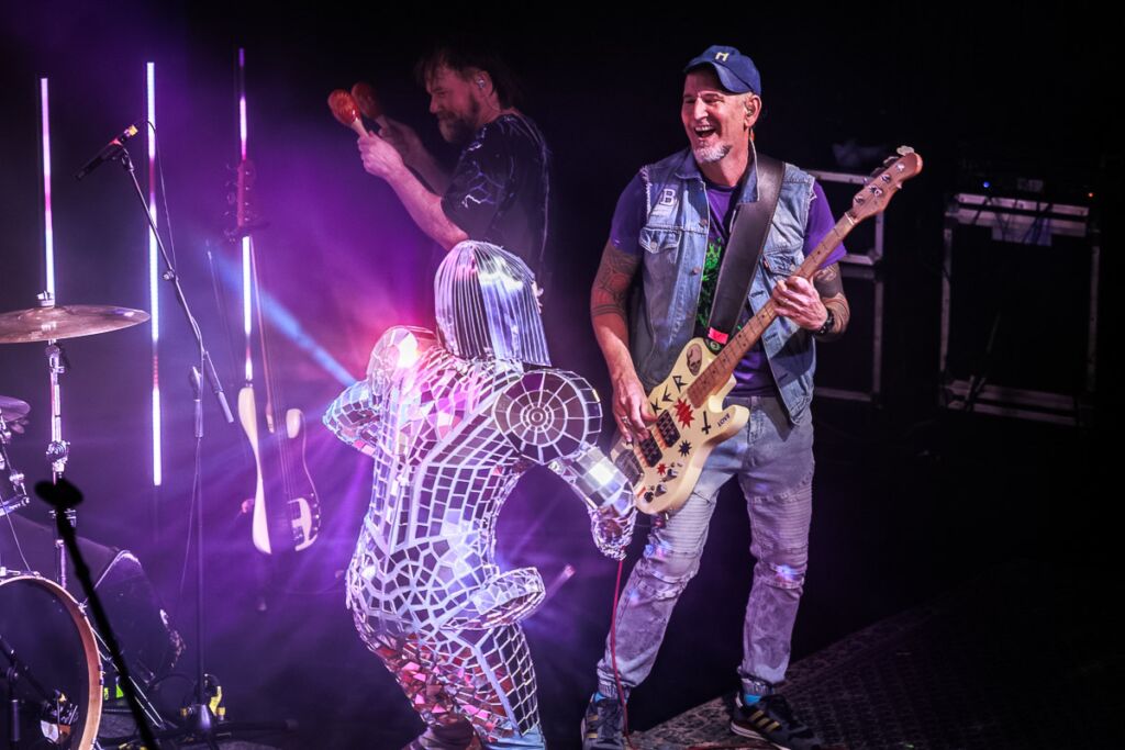 Highlights came thick and fast. There was the very Rock Eisteddfod-style moment during ‘Fat Cop’, with the band theatrically “shooting” Peter on drums using guitar “guns” – completely unexpected and genuinely laugh-out-loud funny. Then came ‘Polyester Girl’, which somehow elevated things even further: a mirror ball-clad “Polyester Girl” dancing and gyrating across the stage, crew members jumping on instruments, total sensory overload. Hectic? Yes. Chaotic? Absolutely. Amazing? Without question.